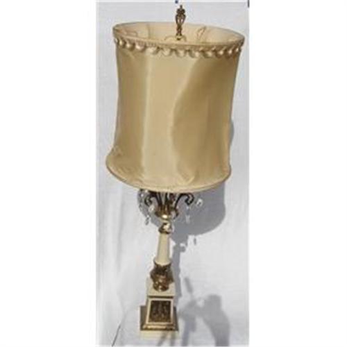 This lamp is absolutely incredible! A vintage find from either the 40's it is in perfect working condition. We have been told (by the original owner) that this is a Rembrandt lamp but can not confirm that because this piece is unmarked. Standing an impressive 53" tall this was made when homes had extremely high ceilings and for someone who wanted to impress their guests. The body is cast iron with bronze outer areas for the details and scrolls and 2 areas coated with a creamy white paint. The bronze has a lovely reddish patina. The paint is also perfect with the exception of 2 small places (we tried to show with pics but they are very small) where the paint has worn. The upper area has 5 scrolls that stand 6 1/2" high from which the crystals hang. The crystals have a small round crystal and a large teardrop hanging below. The 5 smaller crystals (these hang on the inside) measure 2 1/4" and the remainder of the crystals measure 3". There is a milky glass shade that reflects up and is in perfect condition. We also have seven extra light bulbs that are 3 way lite and the boxes are marked Commonwealth Edison 102/204/306 watts and the light bulb box is marked C-5PPs25. The socket is quite large, especially compared to today's lighting. It measures 1 3/4". There are 2 different switches on this lamp, one at the back of the base and another on the upper socket. The finial is in perfect condition and is either a double music scroll or a harp. We can't decide. The shade has some tears ...