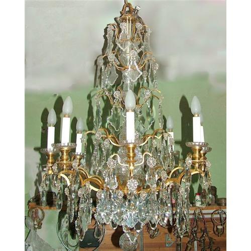 As most first quality Baccarat chandeliers it uses large crystal pendants , the smaller ones are 3 inches height and has lot of 5 and 6 inches height quality pendants, a fantastic 3 inches wide cut crystal sfere, and the original outstanding 8 inches wide bronze canopy , includes also 3 feet of quality class French bronze chain.. unfortunately I can  insert just 4 pictures, but the chain is a piece of art  too. ( ask for picture ).
