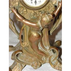 Bronze art deco mantel clock with figural female decoration. Stands 9 1/2" tall.