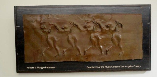 Bronze artwork in modern style mounted on plaque #094 inscribed to Robert and Margie Petersen, as benefactor of the Music Center of Los Angeles County, approx. 12” x 24”; a few minor storage marks in plaque. Petersenname, number penned on back along with AM Brubaker, possibly the artist. From the estate of Robert Petersen. Est.: $300-$600.