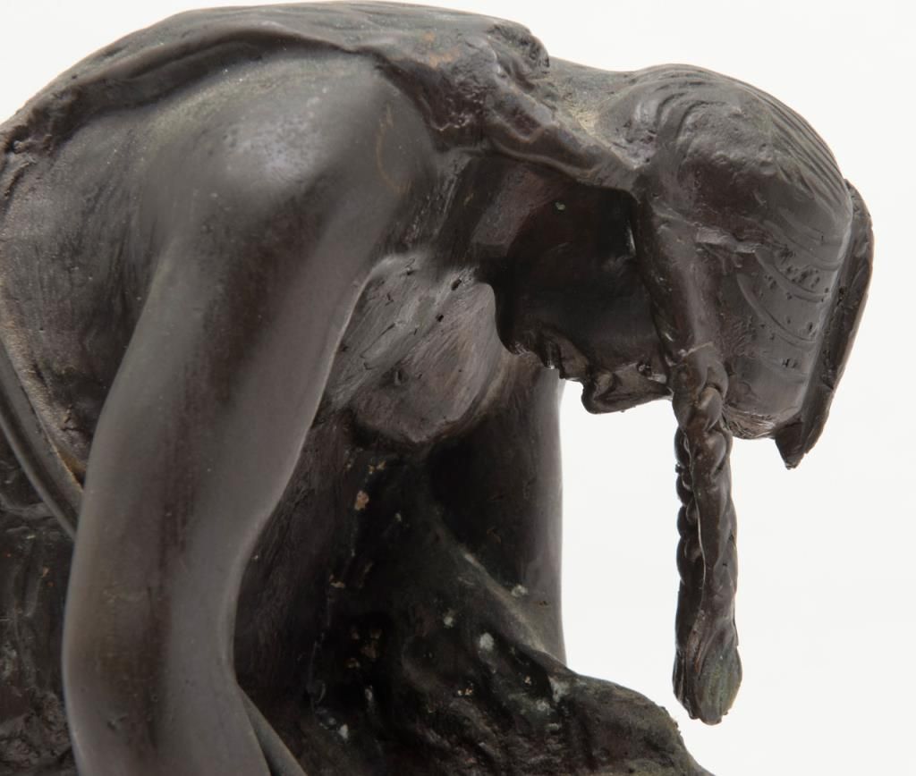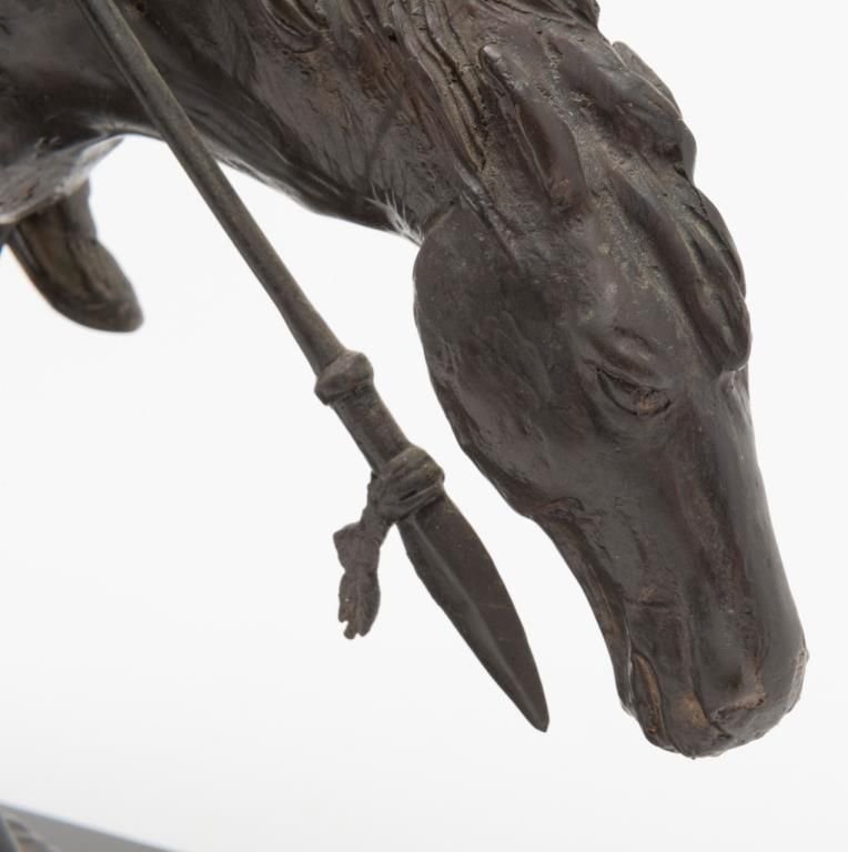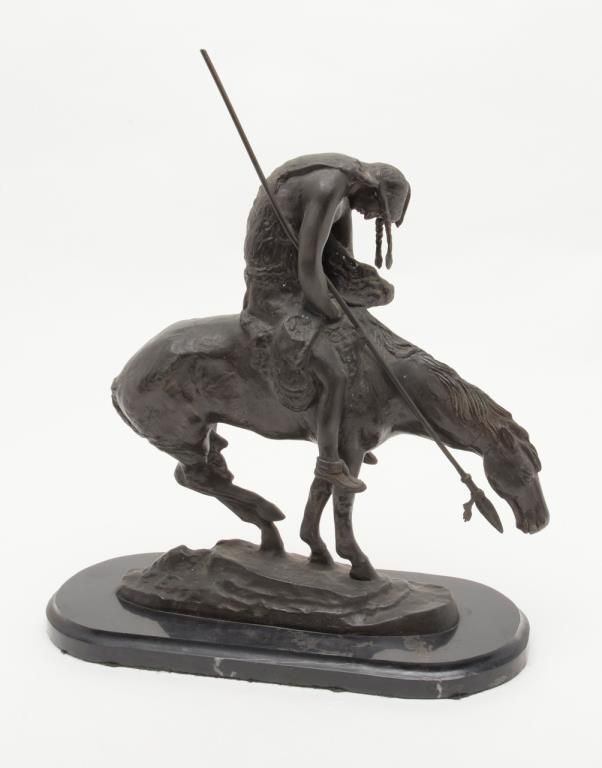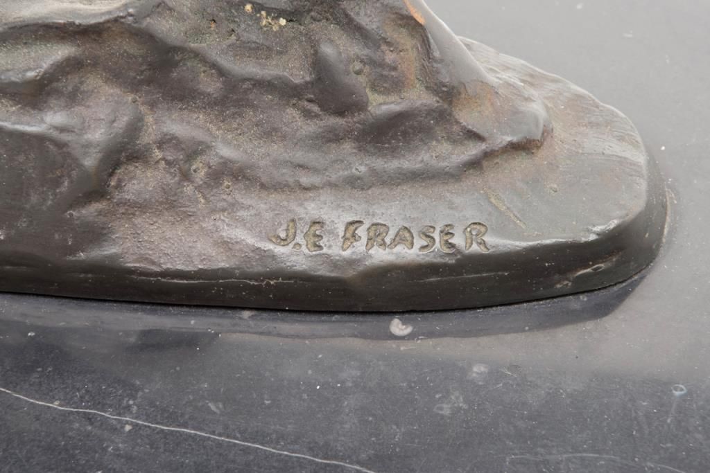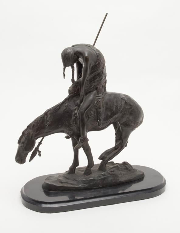 Bronze casting signed “Frazier” of his famous subject, “End of the Trail”; former Robert Petersen collection; shows age and purchased by his Beverly Hills Gallery more than 40 years ago. Not a current re-cast and could be pre-WW II.Est.: $600-$1,200.