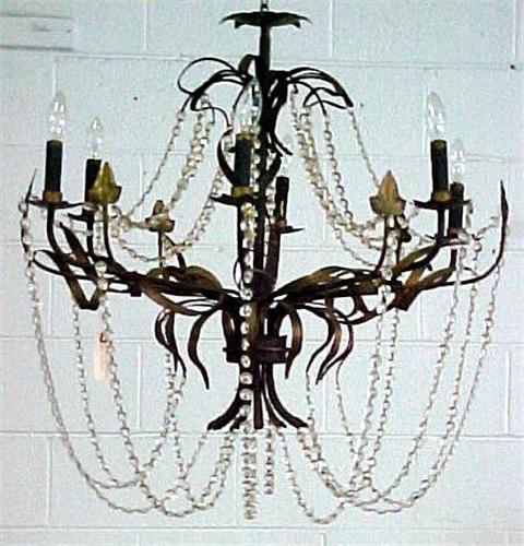 Bronze chandelier with six arms ending in candle lamps alternating with six arms terminating in leaves; cut crystal swag prisms; approximately 30" high x 28" across; early to mid 20th C. (matches chandelier in lot 499 and sconces in lot 500 and 501) (some