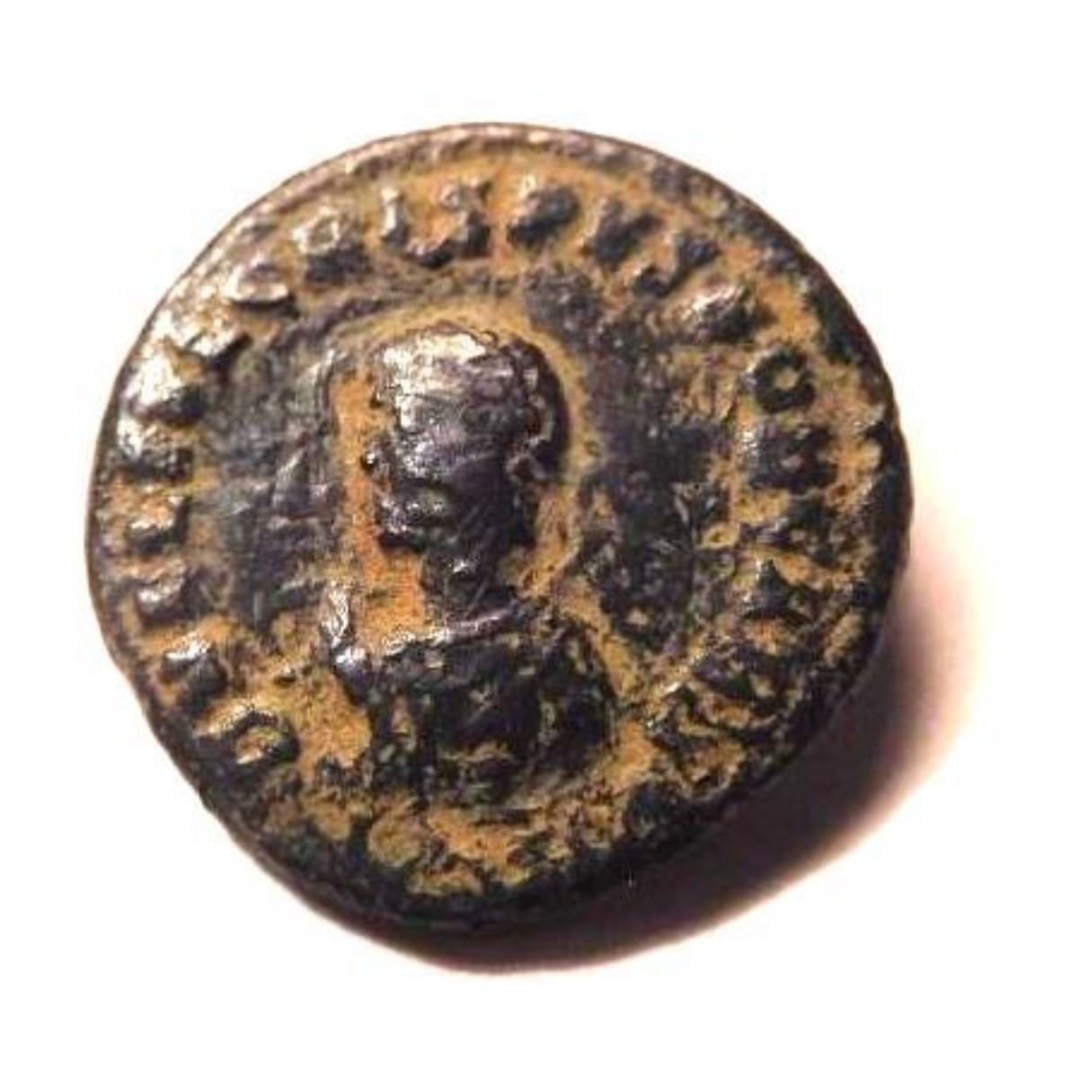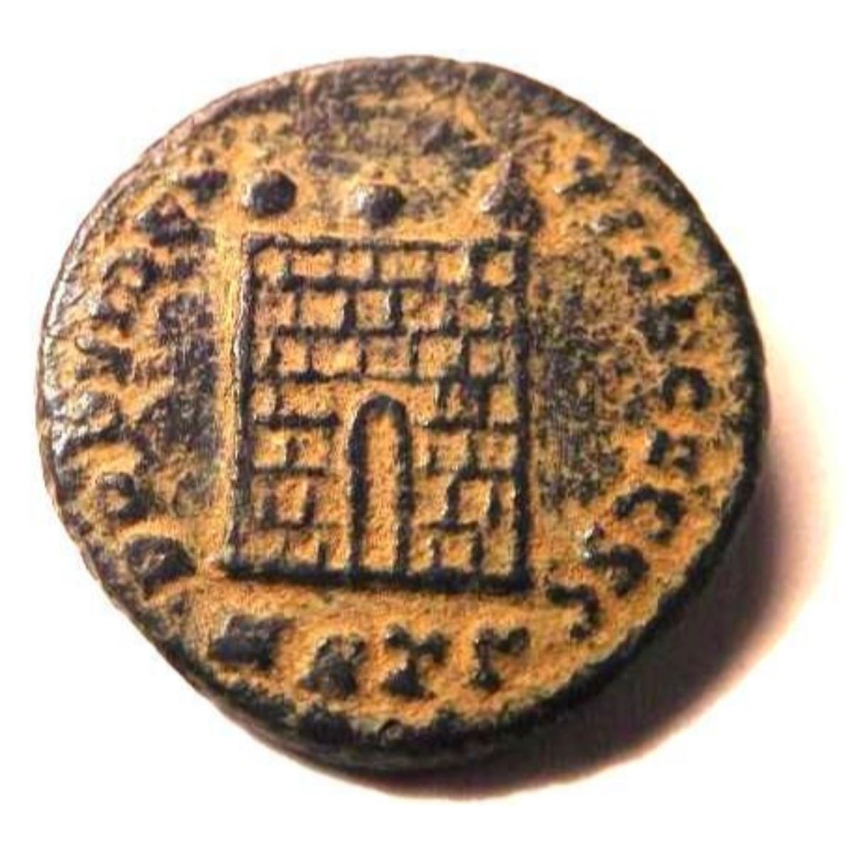 Crispus was the son of Constantine I. He was born around 300 A.D. In 313 A.D., he was granted the title "Caesar", along with his half-brother Constantius II and his cousin Licinius (Licinius II). In 326, Constantine I actually executed his son Crispus, and shortly thereafter drowned his mother. The reverse on this coin features a campgate, and reads: PROVIDENTIAE CAESS "(Dedicated to) the foresight of our Caesars". JC-30101-143 JC-30243
