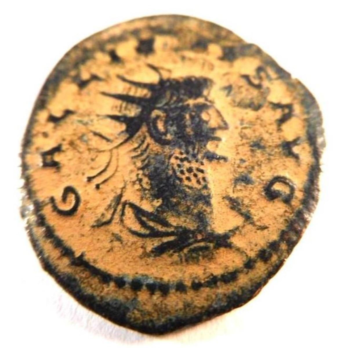The reverse of this coin depicts Gallienus after a victory in battle, and reads VIRTVS AVG "virtue of the emperor" Gallienus, born in about 218 A.D., was the son of Valerian I. Valerian named him Caesar in 253 A.D. Gallienus' fifteen year reign is notable. During the instability of Crisis of the Third Century, civil wars resulted in the death of many emperors shortly after their ascent. In 268 A.D., Gallienus was murdered. While details are uncertain, many of Gallienus' officials wanted him dead. ? JC-30101-33