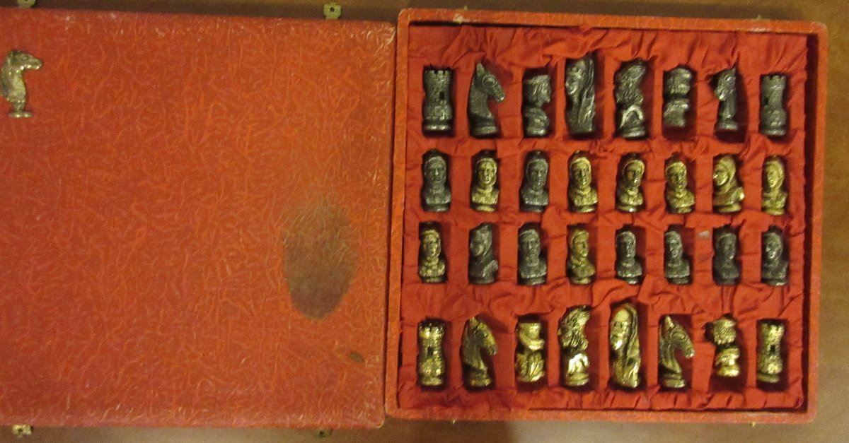 Chess Set Bronze Copper (not sure of metal) Plate in case ( the case is in need of repair) All pieces look nice