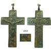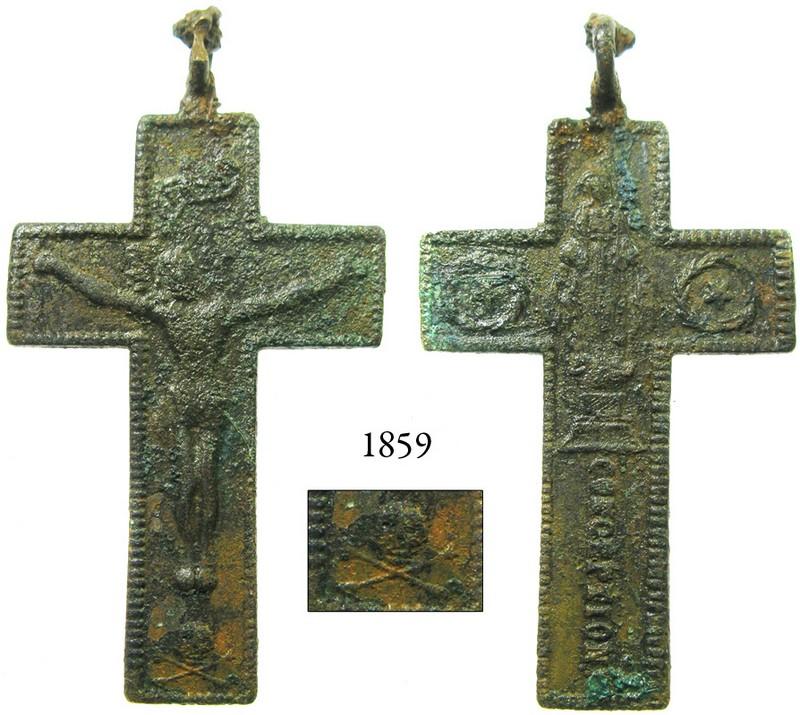 Bronze cross, probably French, 1600s. 3.2 grams, 1-3/4" x 1". Small, flat cross with Christ on front, Virgin Mary on back above CONCEPTION (not the way it would be spelled in Spanish or Italian), dull brass color underneath light patina, intact loop at top for wearing. With photo-certificate.