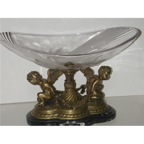 A stunning bronze and crystal centerpiece with a bronze base depicting two cherubs/putti holding up the crystal centerpiece bowl. Floral swags of bronze drap and accent this lovely piece.
