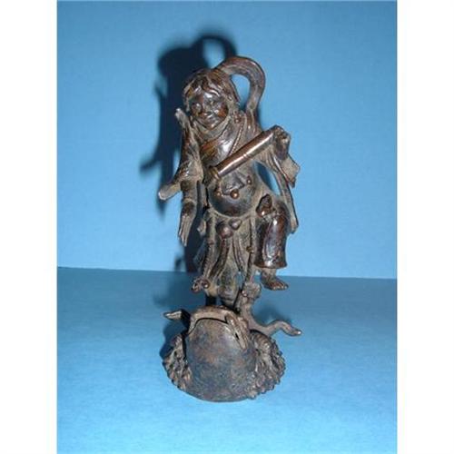 A bronze figure of a man dancing on the back of a giant tortise. There is a very small area of wear on the back of the man's jacket and part of his left hand is missing.