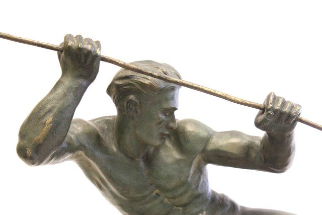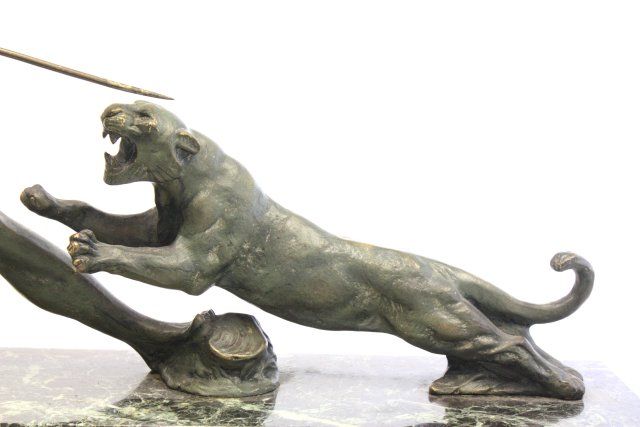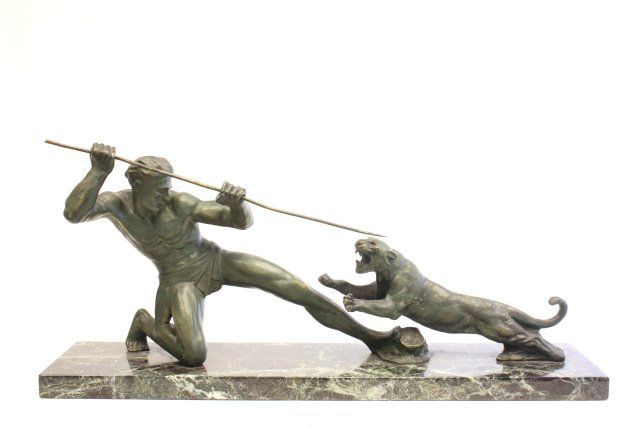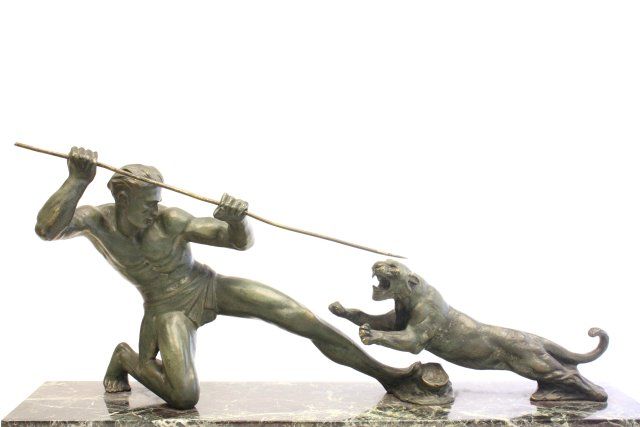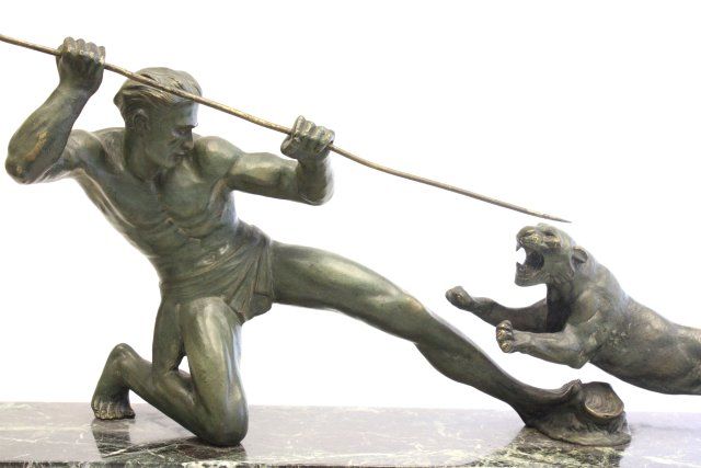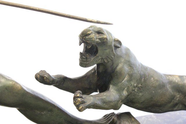 "Male Hunter with Spear Attacking Tiger" on marble base. Approx. 17" x 32" W Please read our terms of sale.