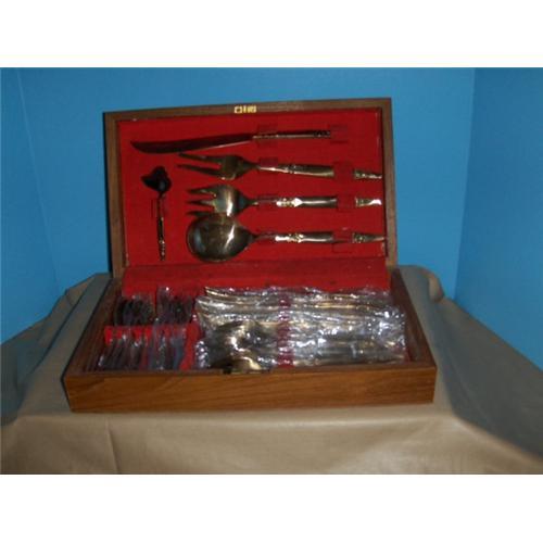 Bronzeware service for 8 plus carving set in plain wooden chest. This is solid nickel bronze and according to the protective sleeves (which are on 99% of the pieces and sealed at both ends), it is "the only lifetime guaranteed Thai bronzeware". Set includes in addition to the aforementioned carving set, a salad set, a small jelly server, 8 knives, 8 forks, 8 spoons... none of which appear to ever have been used. Absolutely WONDERFUL!!! Purchase any three items that we can ship in one container, pay with PayPal and qualify for FREE shipping.
