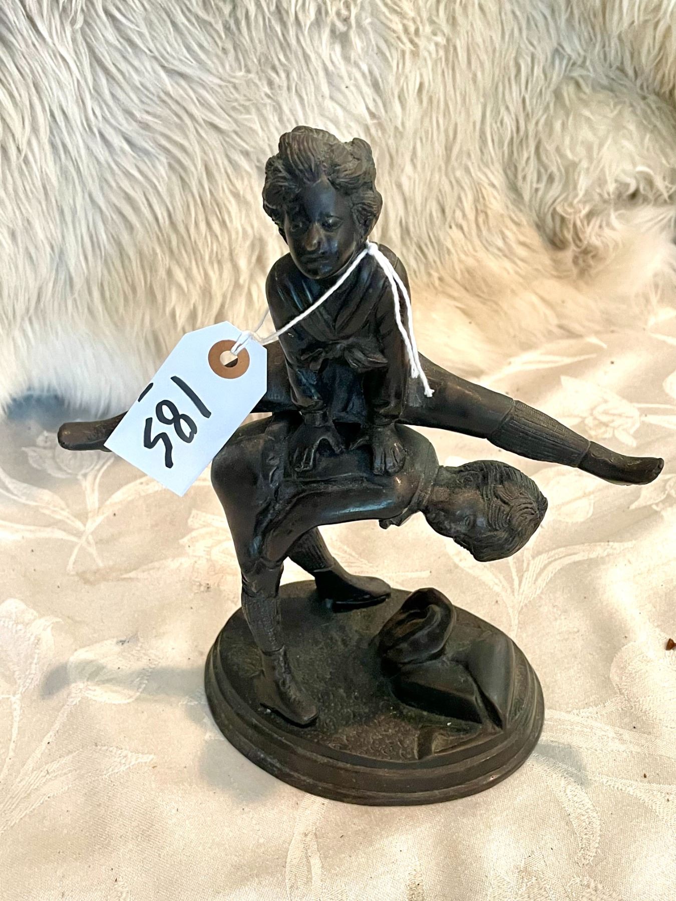 A bronze sculpture of two boys playing for sale in the auction is a delightful piece, capturing youthful joy and camaraderie through intricate details and a warm patina that highlights the artistry of the moment.