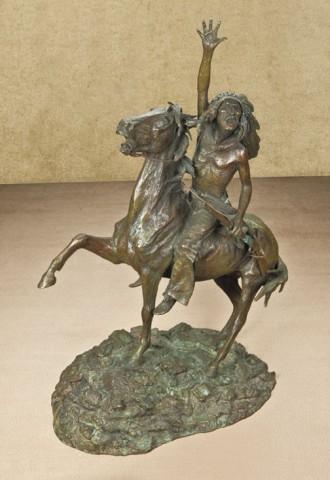 Bronze of Indian chief on horseback entitled “Rallying his Warriors” by Ernest Berke, dated 1979. #1 of 20. Approx. 20” in length, 11” in width, 25” in height. Great patina. A well-known contemporary western artist whose works are offered in many prestigious galleries in Santa Fe, Scottsdale, and Jackson Hole as well as the east coast. From the Robert Petersen Collection. Est: $750 - $1,500