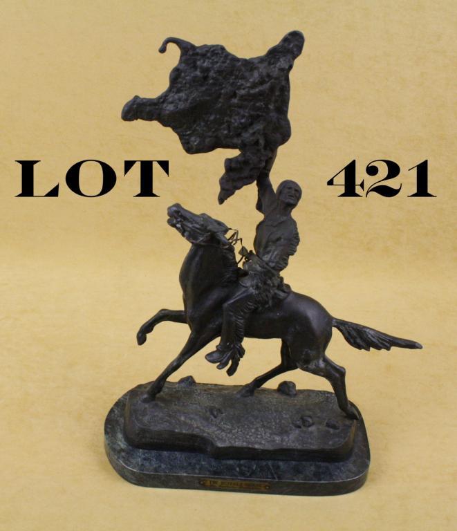 Bronze re-cast of Remington’s “The Buffalo Signal”, approx. 15” in height on stone base and approx. 10” overall in overall good condition showing an Indian Brave on horseback waving a buffalo hide overhead.Est.: $150-$300.