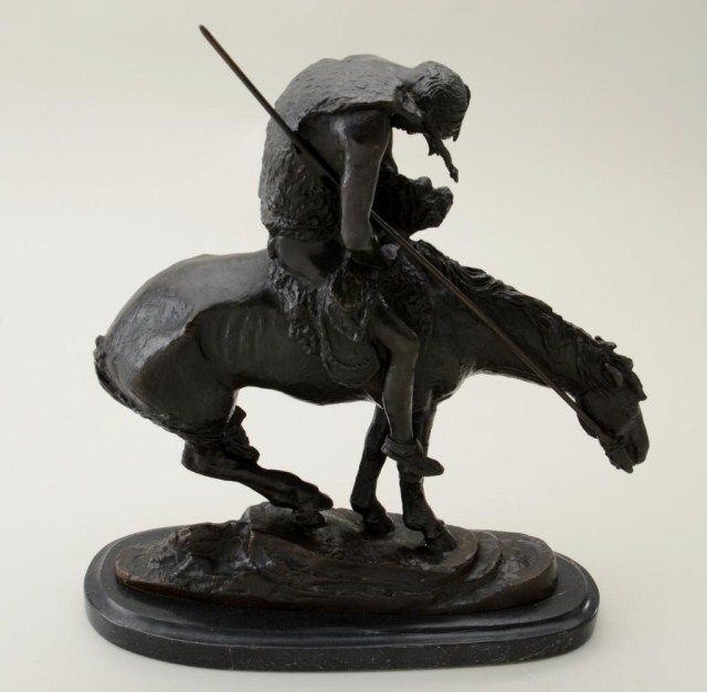Bronze statue “End of Trail” signed James Earle Fraser, 18-1/4” x 16 x 6-1/2” mounted on bronze base; consignor has had for over 40 years and believes it possibly is original. Est.: $600-$1,200.