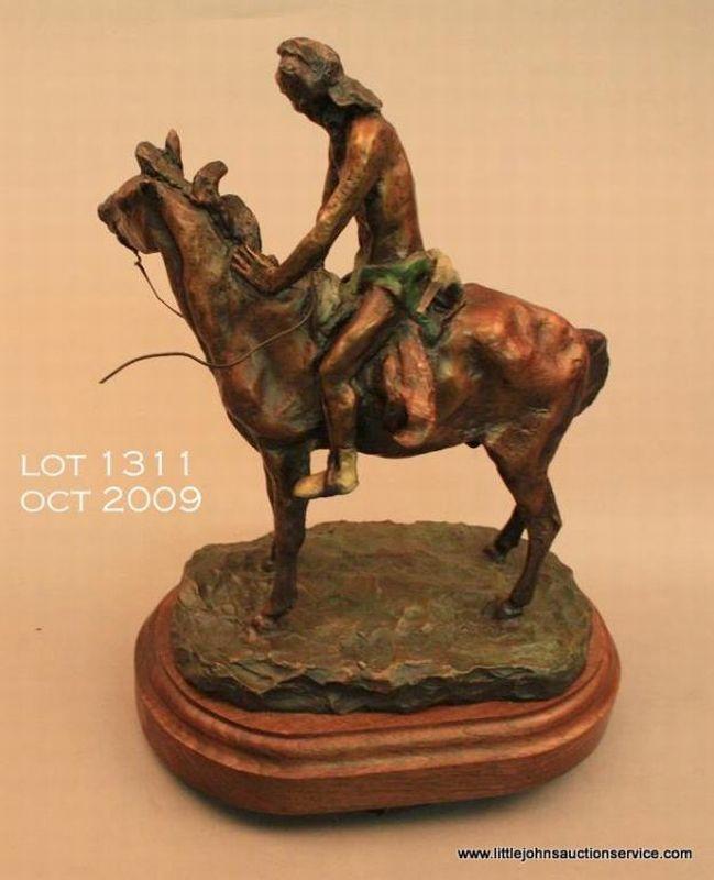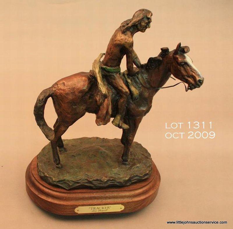 Bronze statue on wood base by Ace Powell titled “Tracker” showing an Indian on his horse, approx. 12” in height and approx. 10” long with a width of approx. 5”. Nicely accomplished and in very good condition; signed Vance Bronze, 20/30. Est.:$900-$1,300.