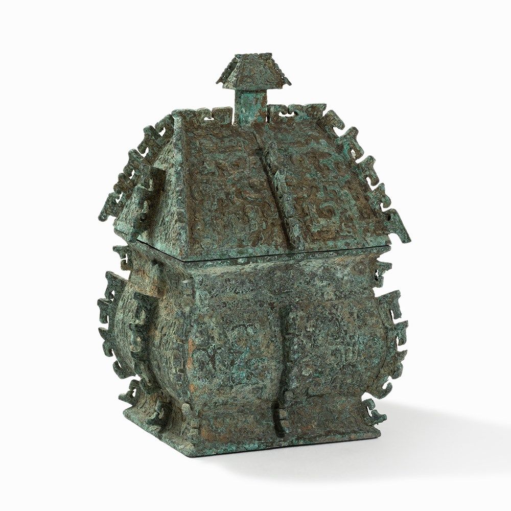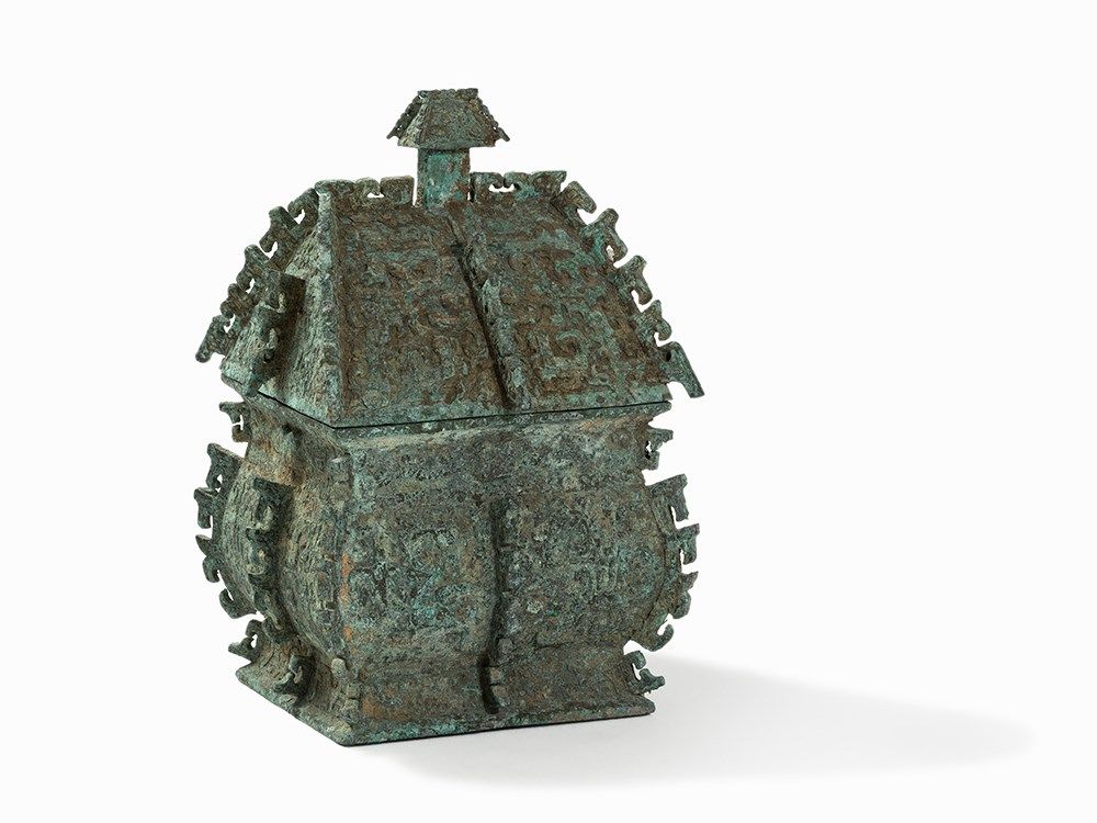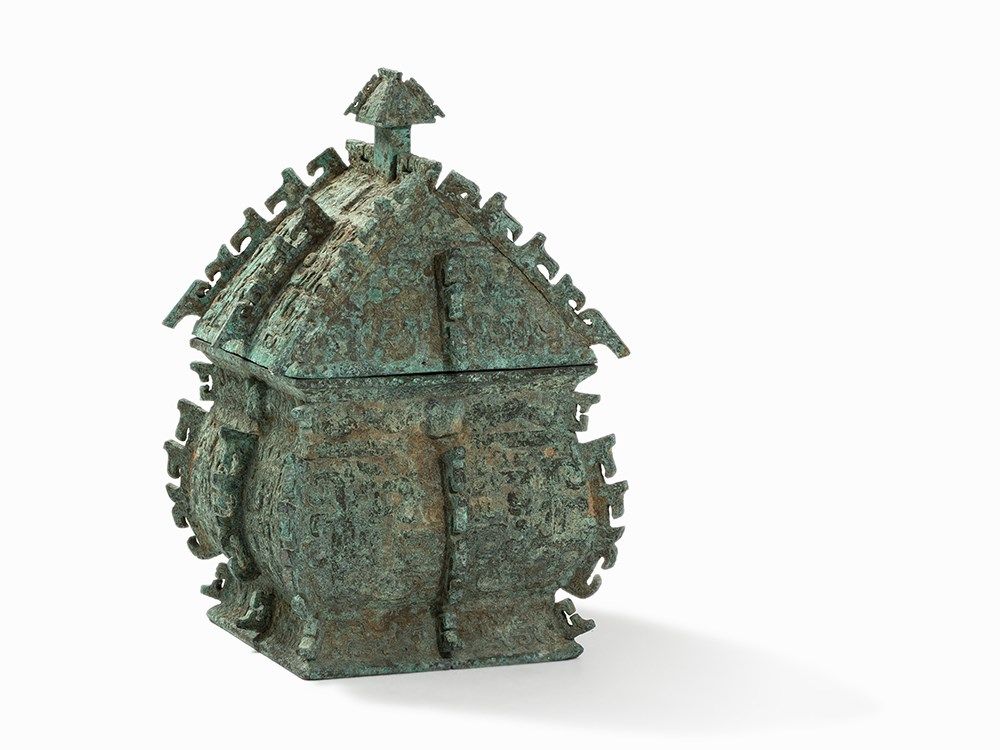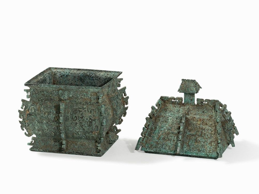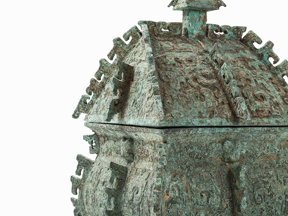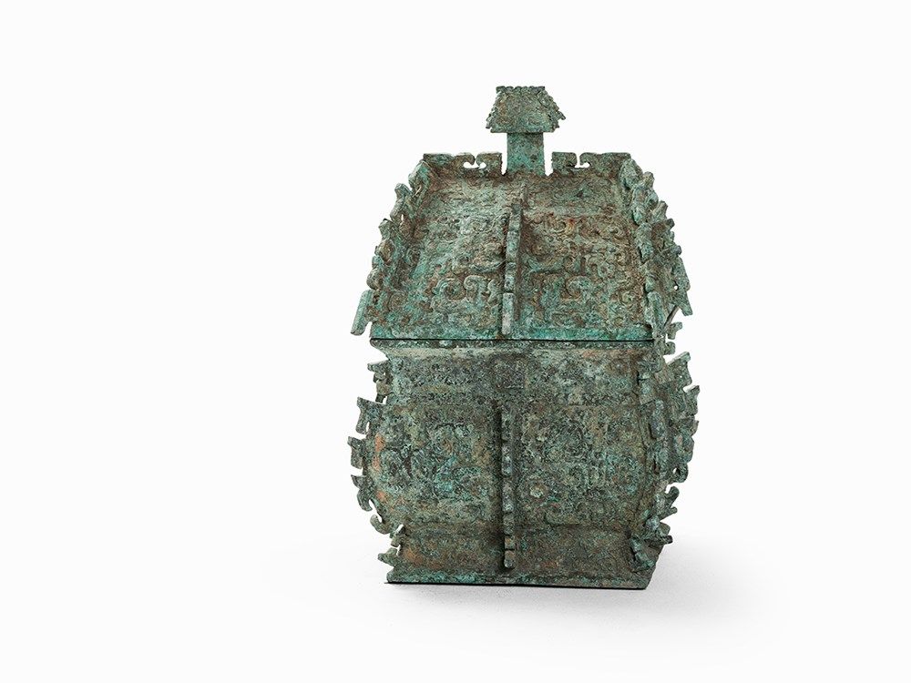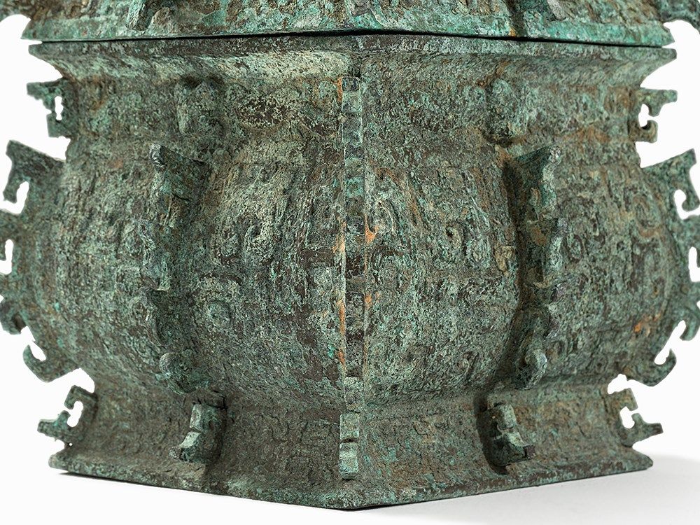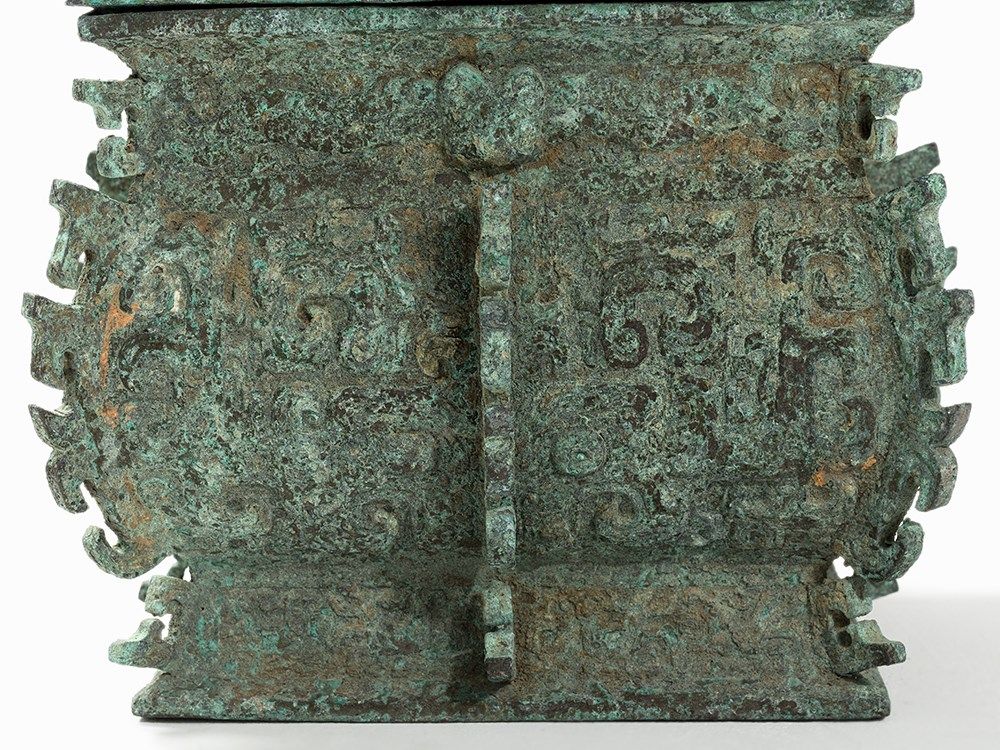 Fangyi vessels belong to a very rare group of Chinese ritual bronzes. They are characterized by a cubic body with a roof-like lid with a knob handle. Their walls are decorated with relief Taotie masks framed by a border of mythical creatures. Flanging runs vertically across the body and lid, exaggerating their straight edges (1). In all likelihood, Fangyi vessels were ritual wine containers used during ceremonial acts. In relation to other types of vessels from the Chinese Bronze Age, there are only a few known examples. One the one hand, their scarcity and stressed importance can be explained by the fact that this type of vessel – according to current research – was only produced over a short period of time. They were made between the late Shang and early Zhou dynasties; between approximately 1300 and 1000 B.C. On the other hand, producing Fangyi vessels required considerably more effort than round vessel types. The process involved a complex, form-based molding procedure that required a high level of technical ability. This appears to explain the special appreciation for Fangyi vessels. Archaeological findings clarified that they were only discovered in exceptionally well-furnished graves. Their use was therefore reserved to a noble elite of high-ranking personalities and very special occasions.