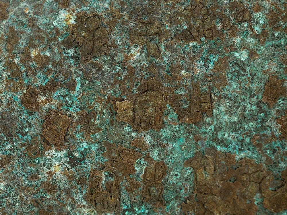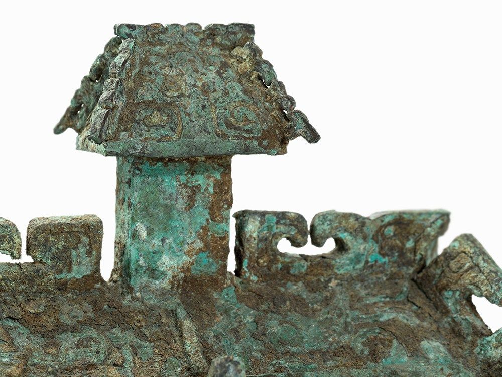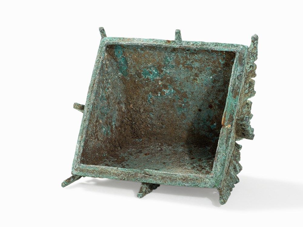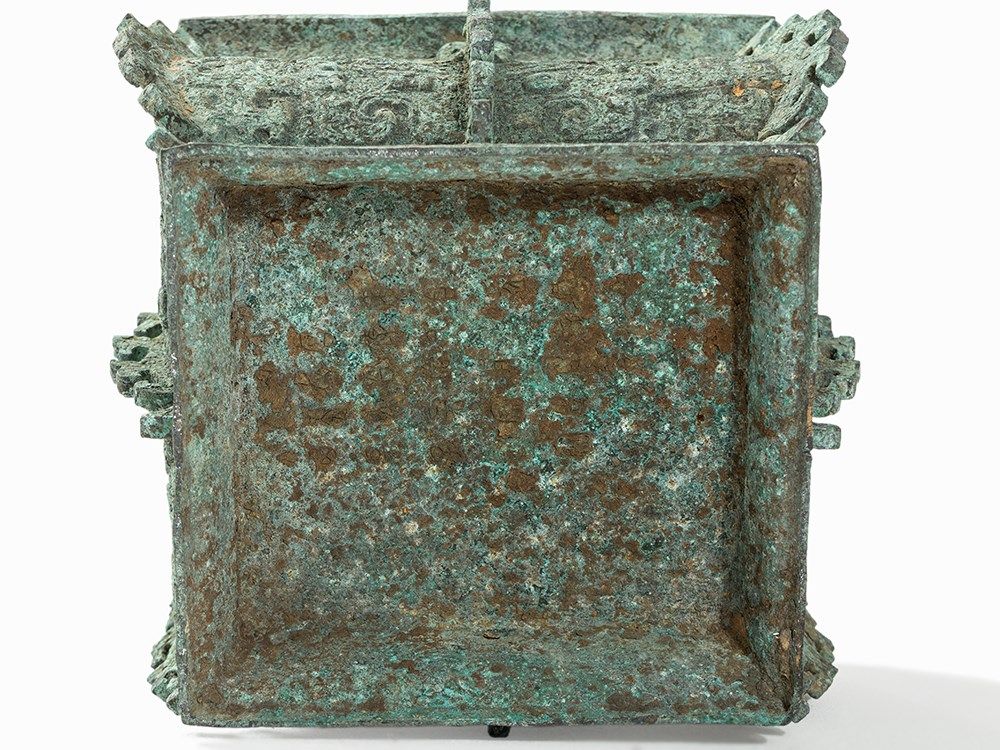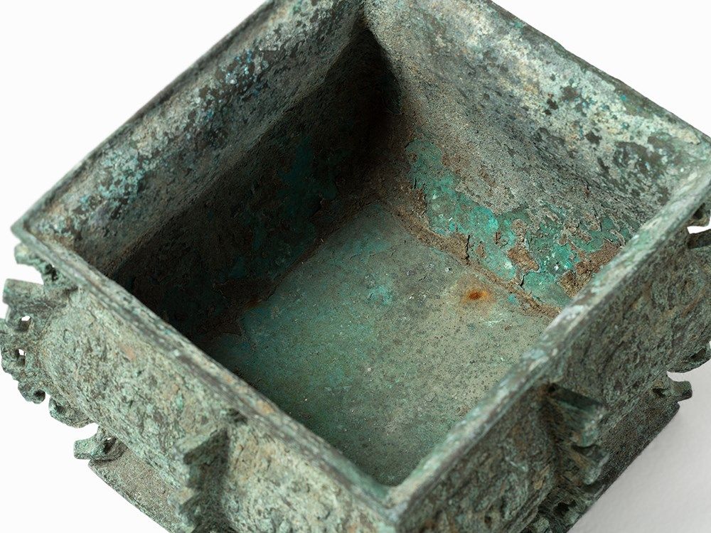 Comparing the “Ling Fangyi” in Washington with this one reveals some astounding similarities. The arrangement of the flanging, the decoration of the Taotie masks and the ornamental mythical creature borders are especially striking. The offset foot profile found in both vessels suggests they were both probably intended to be presented on some form of stand. The two objects also show similarities regarding their material. Both Fangyi vessels display specific traces of corrosion on the roof-like lid. The powdery green to white efflorescing corrosion is known as “bronze disease” and is a result of active corrosion due to copper chloride (7).