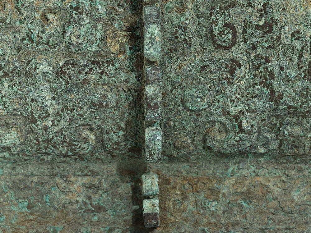 The surface of the wall dissolving into a lively deep relief with taotie masks on a spiral underground