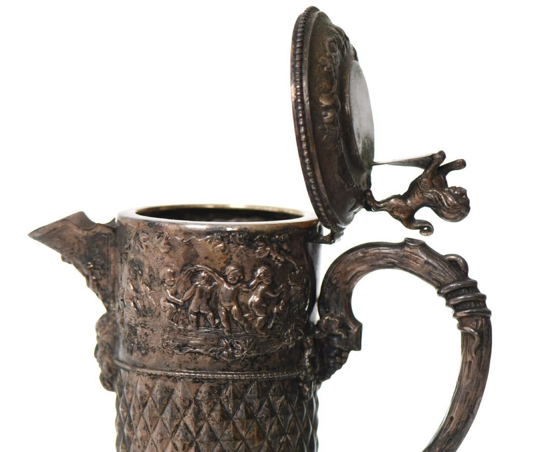 Bronzed Metal Wine Ewer Or Coffee Pitcher Adorned With A Lion Hinged Lid And Cherub Engravings. Markings: Made In Portugal. Estimated more than 100 yrs old. Italian art dates back to the Ancient Romans who left remains in Italy of extraordinary richness. Italian painting began to develop beyond the influence of Byzantium in the Duecento or 13th century, maintaining its lead throughout the Italian Renaissance, and reaching a particular peak in the High Renaissance of Leonardo da Vinci, Michelangelo and Raphael. Italy retained its artistic dominance into the 17th century with Mannerism and the Baroque. In the 18th century Neoclassicism originated in Rome, but this was the last such Italian-born style that spread to all Western art. However, Italy maintained a presence in the international art scene from the mid 19th century onwards. Italian art has influenced several major movements throughout the centuries and has produced several great artists, including painters, architects and sculptors. (Wikipedia) Size: See Ruler Photo. (Photos Represent The Condition Of The Lot.)