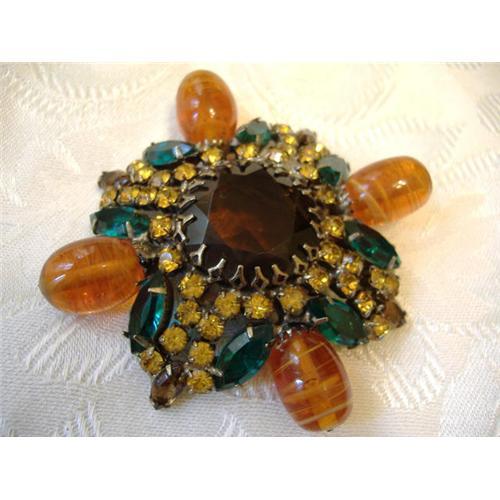 Unsigned beauty that was most likely special made for a special customer. Giant rhinestone and cut glass brooch; Very unique shape with brilliant colors of smoky topaz, topaz and emerald green; all prong set with silver pot metal backing; when the light hits this beauty it really glows; This is the most interesting brooch I have seen.