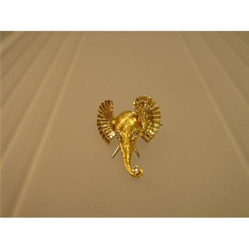 This is an exquisite 18ct. gold and diamond brooch in the form of an elephants head!It is goldsmiths craftsmanship finely worked in 18ct gold, with diamond eyes and with a diamond at the end of the elephants trunk.It measures H.3cm x W.2.5cm. x D.5cm. and weighs 6grms.It was made in Germany in the 70s. It is very beautiful and has a charming almost cheeky look about it! I am sure it would be greatly admired when worn!