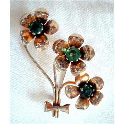 This is a very pretty Deco pin typical of its time, circa 1940's. Gold vermeil with three large multi faceted and claw set green rhinestones at the centre of each flower. It is 3" x 3" inches. Excellent vintage condition. The original "C" close, which was broken, has been replaced with a new safety close on the back.