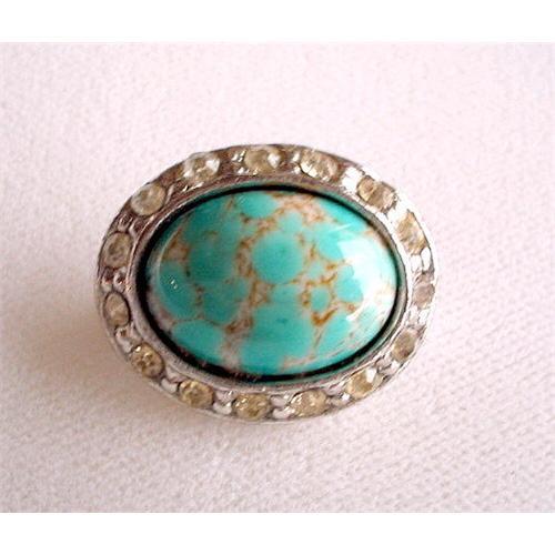 A very pretty brooch with a large cabochon of polished genuine turquoise encircled by sparkling clear rhinestones. Measures 1" x 3/4" and has a safety close on the back, silvertone fittings, excellent condition.