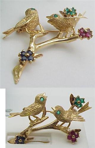 Brooch two birds on a branch with sapphires, rubies and emeralds 14kt yellow gold 7.5gr