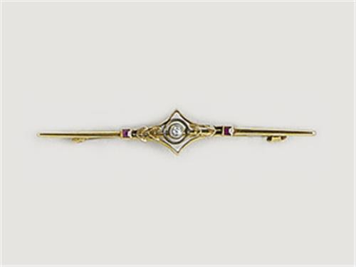 14 K gold, straight baton, at the middle part widening foliate motif, 1 small brilliant cca. 0.05 ct (R2CrSi) and 2 synthetic rubies, circa 1930, marked, weight: 3.1 g, in good condition.