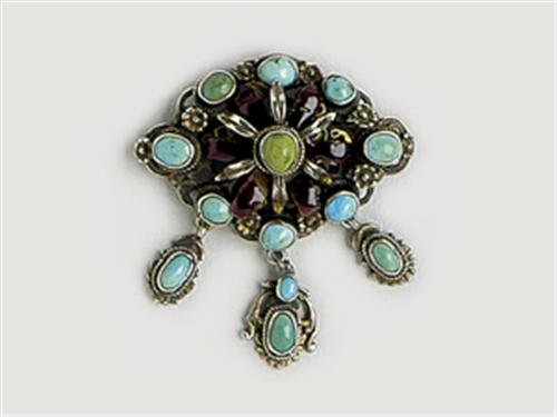 Silver, pierced oval base, applied decoration, turquoise cabochons and claret colour enamel decoration, 3 drop shape pendants, circa 1930, unmarked, in good condition.