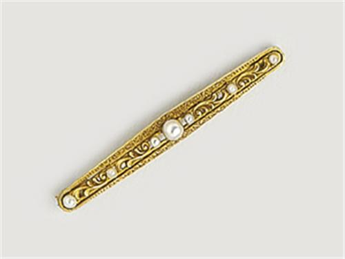 14 K gold, longish form, 1 bigger and 6 tiny pearls, circa 1930, marked, weight: 3.7 g, 1 pearl is replaced.
