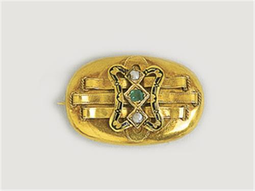 18 K gold, oval embossed form, applied ribbon motif decoration, black enamel, 2 pearls and 1 green glass bead, late 19th century, marked, weight: 8.5 g, in good condition.