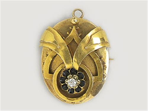 14 K gold, oval form, applied tiny beaded decoration, black enamel and 1 claw set brilliants 0.23 ct (R2CrP1), picture holder on the backside, late 19th century, unmarked, weight: 15.5 g, dented, the glass is missing.