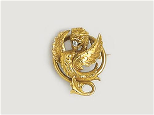 18 K gold, plastic chimera form, 1 brilliant cca. 0.05 ct (R2CrP1), French mark, last third 19th century, weight: 7.0 g, restored.