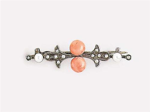 Silver, straight baton, 2 coral lenses and tiny pearl decoration, circa 1900, unmarked, weight 2.6 g, in good condition