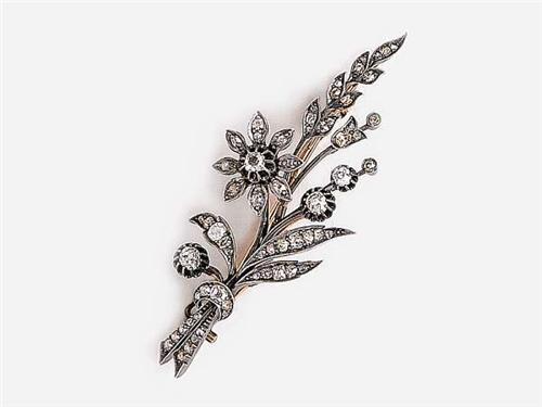 14 K gold and silver, bunch of flowers form, 64 open work set different size and cut brilliants circa 2.5 ct (R2CrSi-P1), it is part of a bigger jewel, second half 19th century, newly marked, weight: 16.5 g.