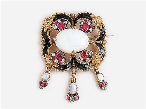 18 K gold, lobed form with pierced black enamel decoration, claw set noble opal, emerald, tiny pearl, ruby and synthetic ruby decoration, 3 suspending parts with opals, it can be worn as a pendant as well, mid 19th century, the pin is 14 K gold replacemen