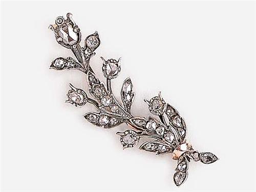 14 K gold and silver, branch with flowers leaves and buds, different size and cut closed set diamonds circa 1.0 ct, late 19th century, unmarked, weight: 8.6 g.
