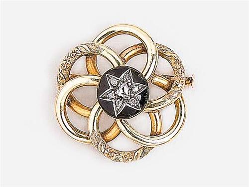 14 K gold, stylised flower form from plain and patterned elements, black enamelled middle part with 7 different size diamonds, Budapest, circa 1940, marked, weight: 7.9 g, in good condition.