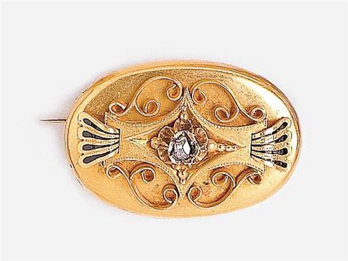 18 K gold, oval form, applied scroll motif, black enamel and 1 diamond decoration, second half 19th century, weight: 10.0 g, restored.