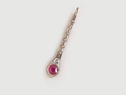 14 K gold, tapering form baton with bead decoration 1 synthetic ruby and 1 diamond circa 0.10 ct, circa 1940, marked, weight 5.3 g.