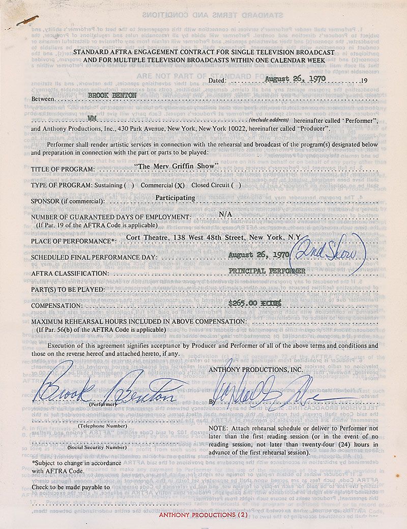 DS, one page, 8.5 x 11, August 26, 1970. Standard AFTRA contract in which Benton agrees to appear on the second Merv Griffin Show on the same day in exchange for $265. Signed at the conclusion in ballpoint by Benton. A standard AFTRA rider is stapled to the main document in the upper left. In fine condition, with expected document wear.