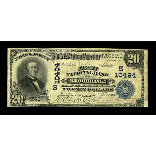 <B>Brookhaven, MS</B></I> - $20 1902 Plain Back Fr. 657 <B>The First NB</B></I> Ch. # (S)10494<BR>A pleasing large size note from the only bank to issue in Lincoln County. <B>Fine.</B></I><BR><BR><b>Shipping:</b> Coins & Currency (<a target="_blank" href="http://www.heritageauctions.com/common/shipping.php">view shipping information</a>)