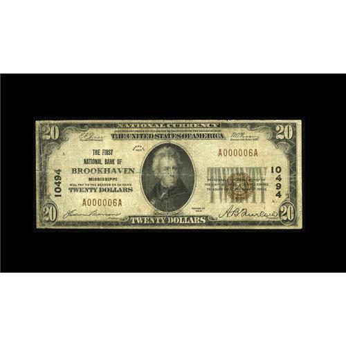 <B>Brookhaven, MS</B></I> - $20 1929 Ty. 1 <B>The First NB</B></I> Ch. # 10494<BR>This is a very scarce note in any grade, with just nine Series 1929 examples listed in the census. This is one of just two twenties. <B>Very Good.</B></I>
