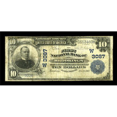 <B>Brookings, SD</B></I> - $10 1902 Plain Back Fr. 624 <B>The First NB</B></I> Ch. # (W)3087<BR> Large notes only from this seldom seen Brookings bank. <B>Very Good-Fine.</B></I><BR><BR><b>Shipping:</b> Coins & Currency (<a target="_blank" href="http://www.heritageauctions.com/common/shipping.php">view shipping information</a>)
