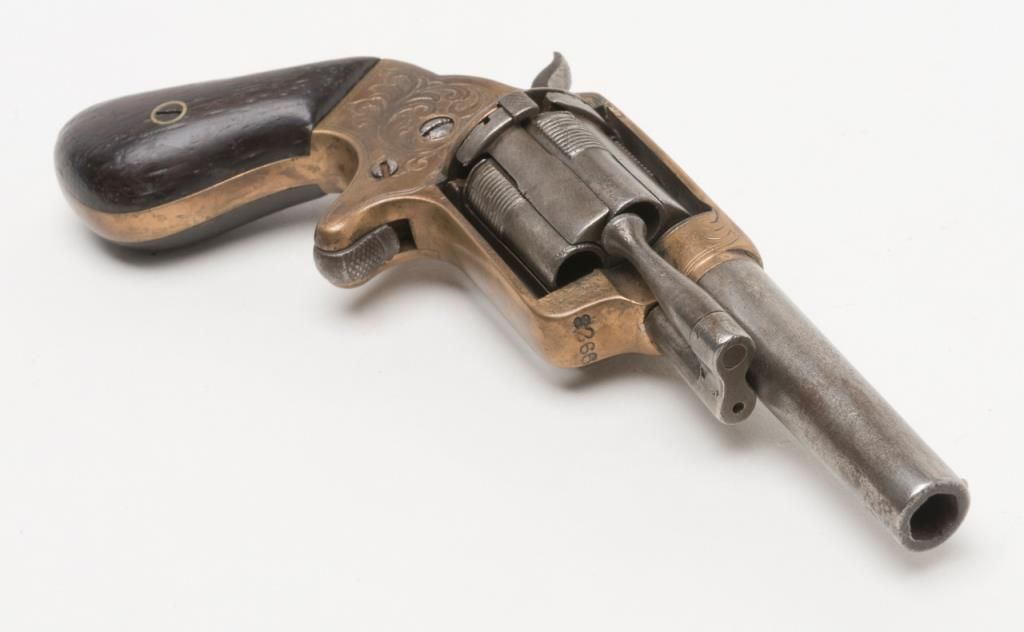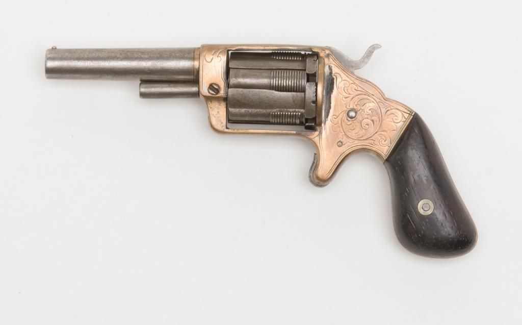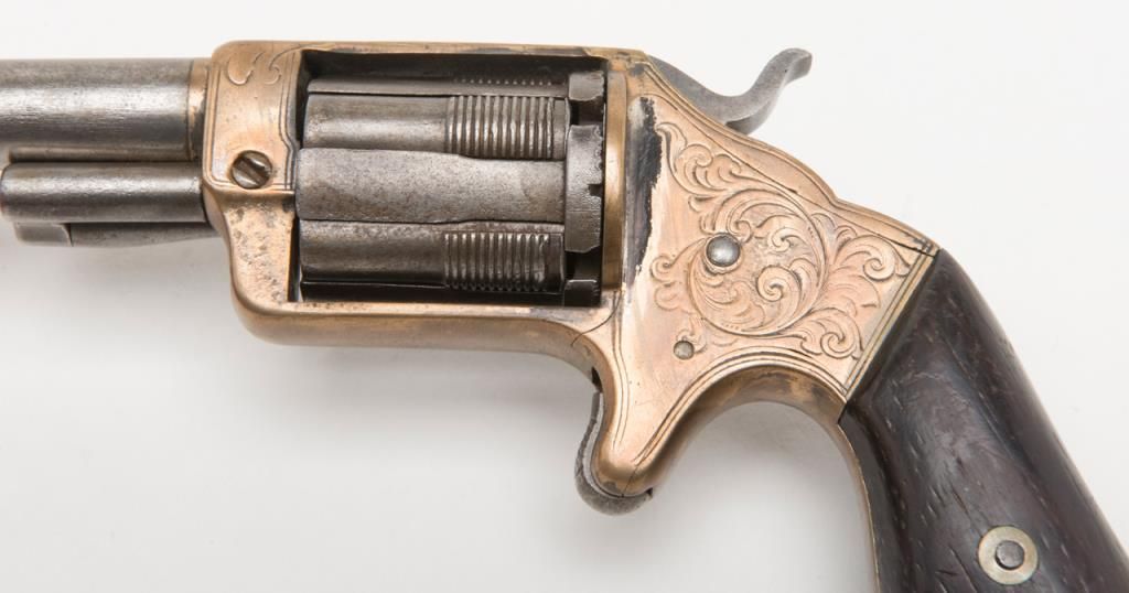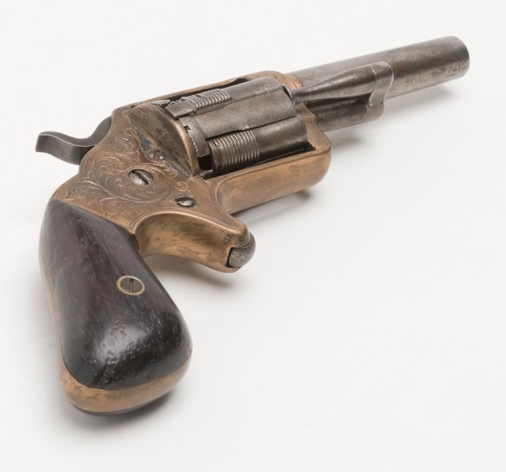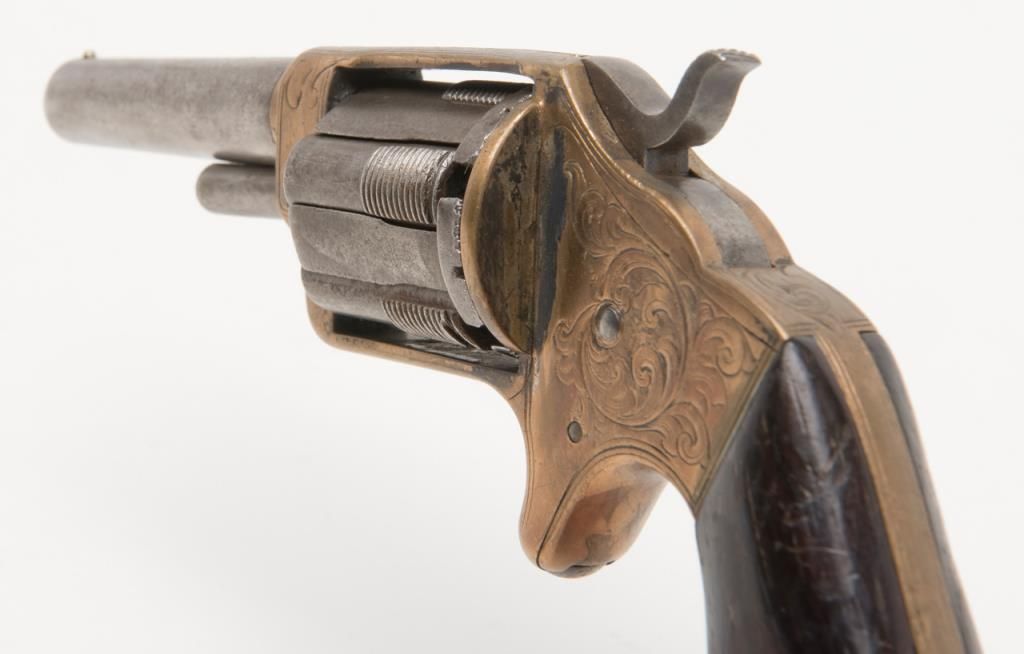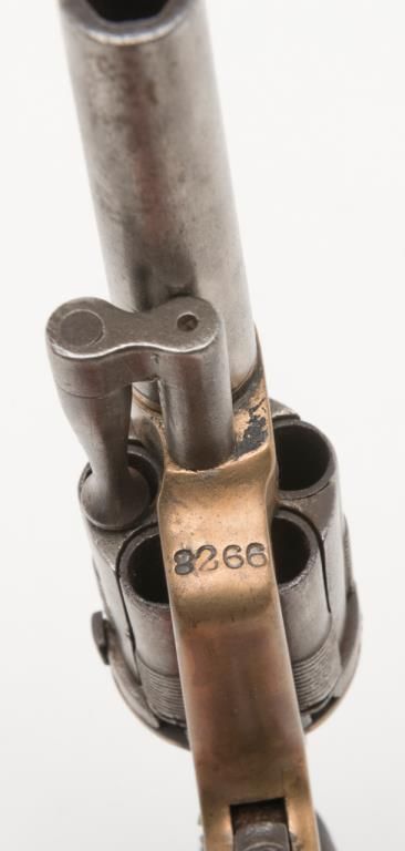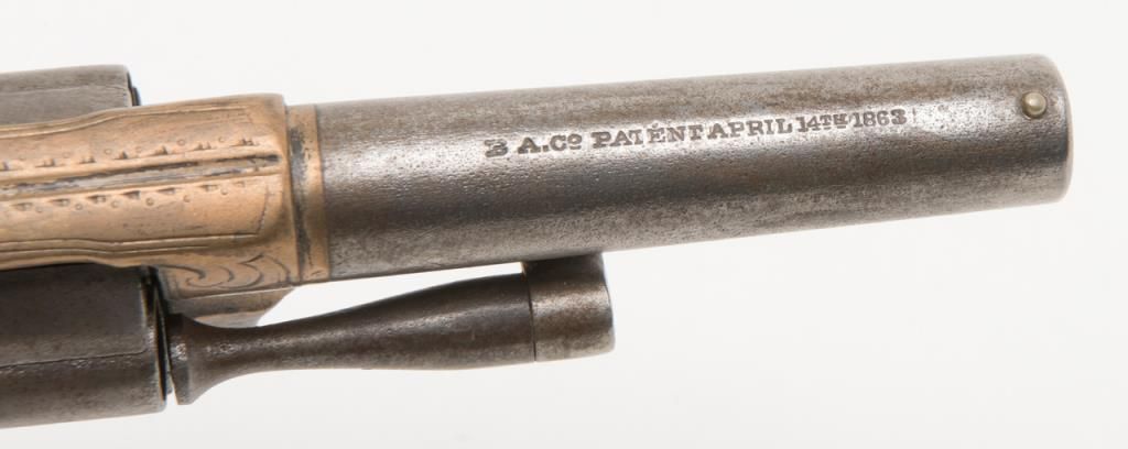 Brooklyn Arms Co. “Slocum sliding sleeve” front loading pocket revolver, .32RF cal., 3” barrel, engraved brass frame, wood grips, #8266 in overall good condition showing an old cleaning with returning patina to metal surfaces; good actionand markings, good grips, dark bore; another attempt to circumvent the Rollin White bored-through-cylinder patent controlled by the Smith & Wesson Co. in the early 1860’s. (Antique). Est.: $300-$500.