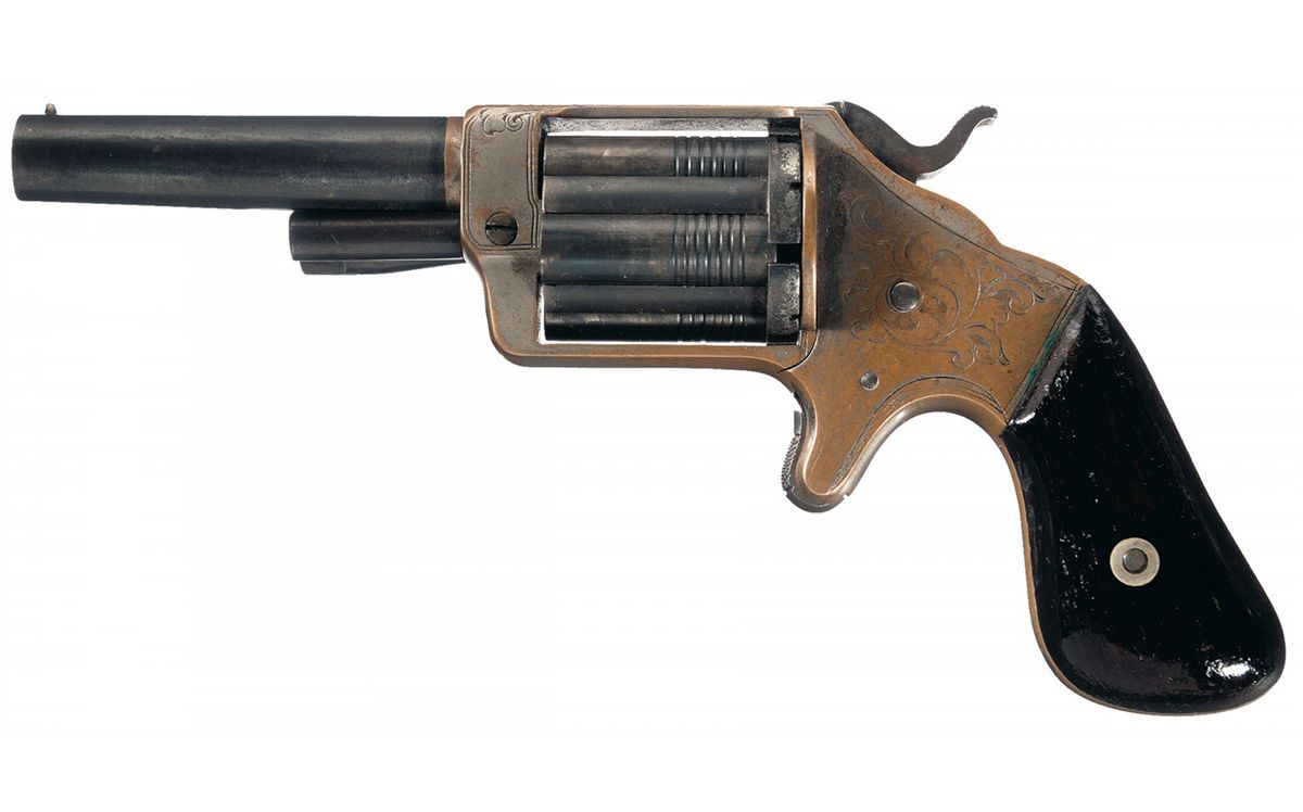 Manufactured circa 1863-64. This revolver is chambered for the 32 rimfire cartridge a features a 5 round cylinder with individual chambers in the form of sliding tubes within cutouts on the cylinder. The chambers slide forward one at a time over a fixed rod on the right side to load and eject. Standard barrel patent marking and standard scroll engraving on the brass frame. The back of the grips are stamped "H/12".
