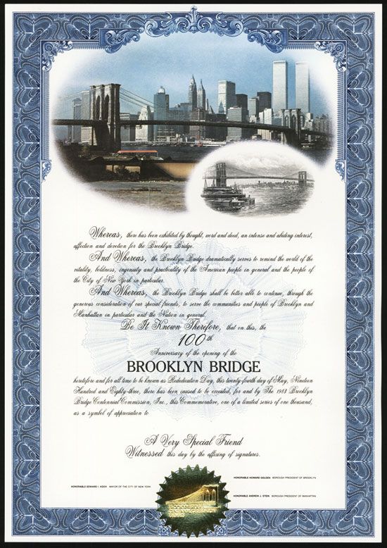Brooklyn, New York, 1983, Lot of eight certificates, Black print on blue border and underprint, Engraved bridge images, gold seal at bottom and litho lathe work on edges, VF condition, ABNC.