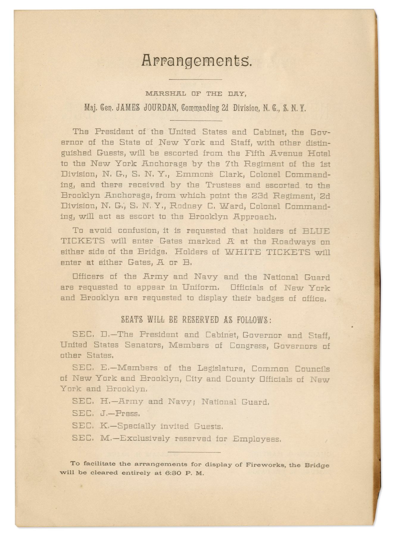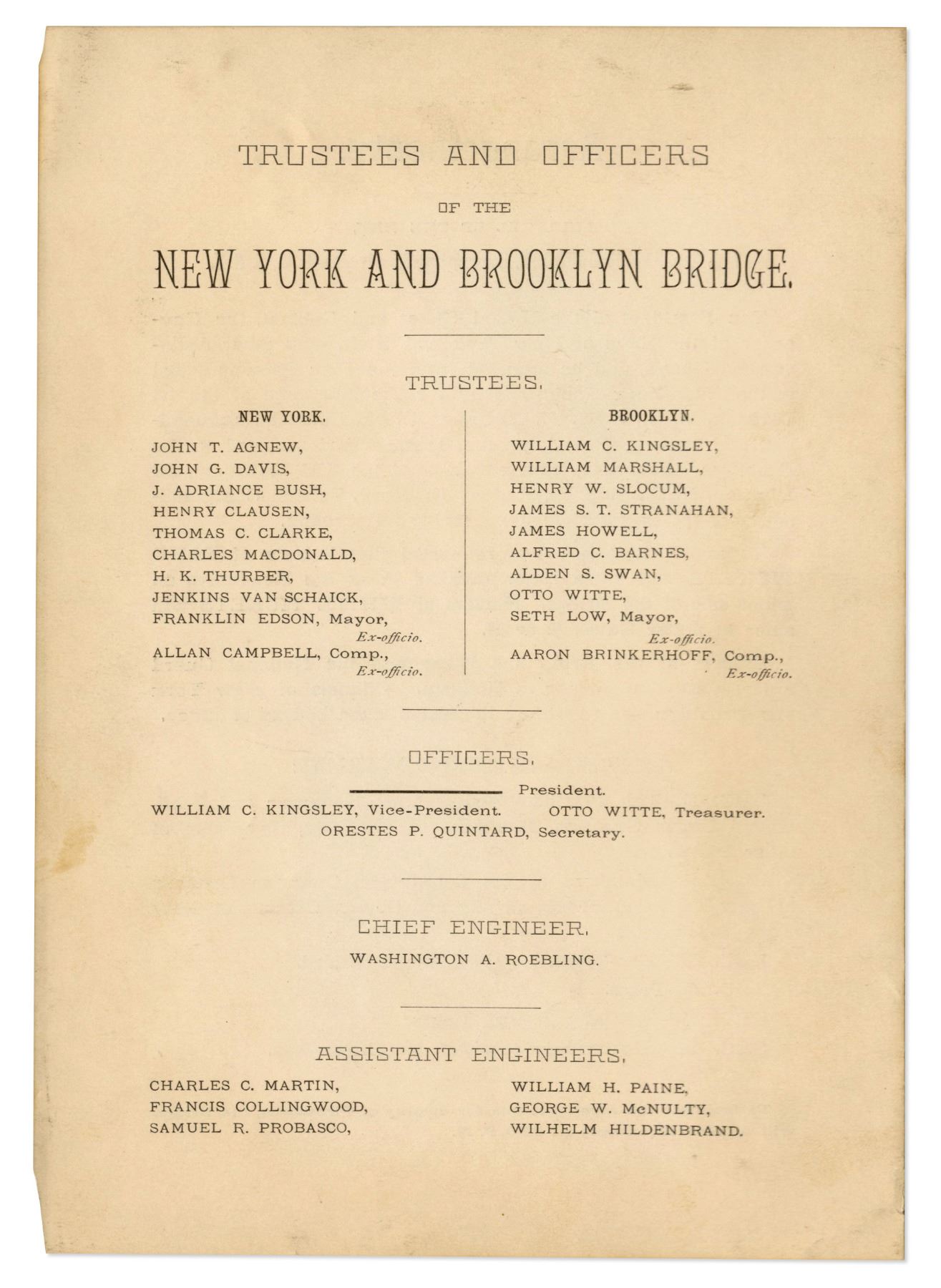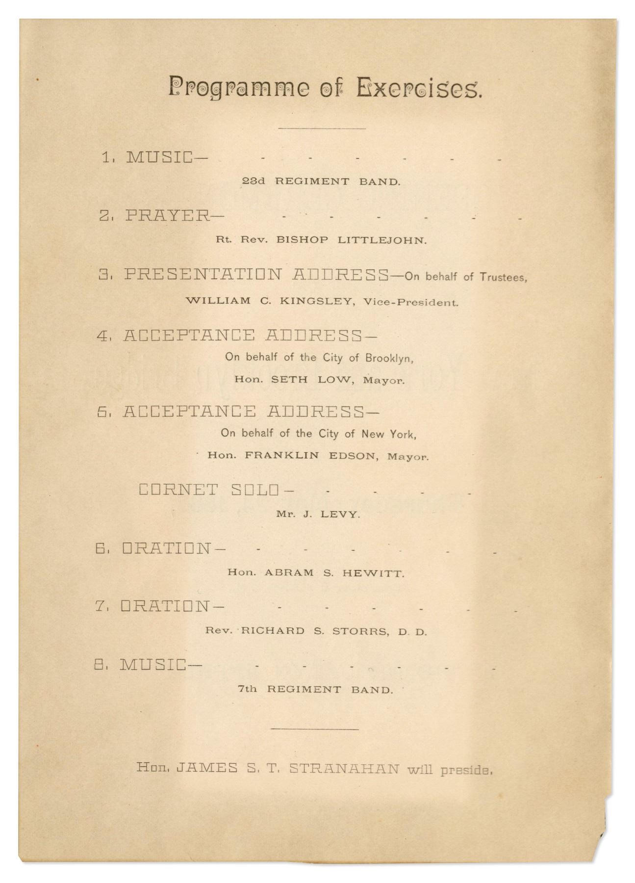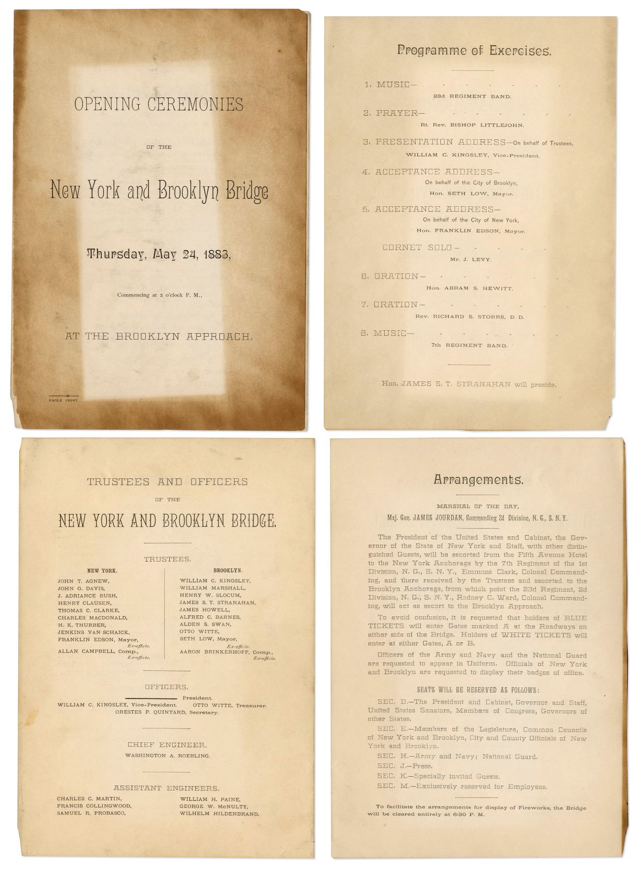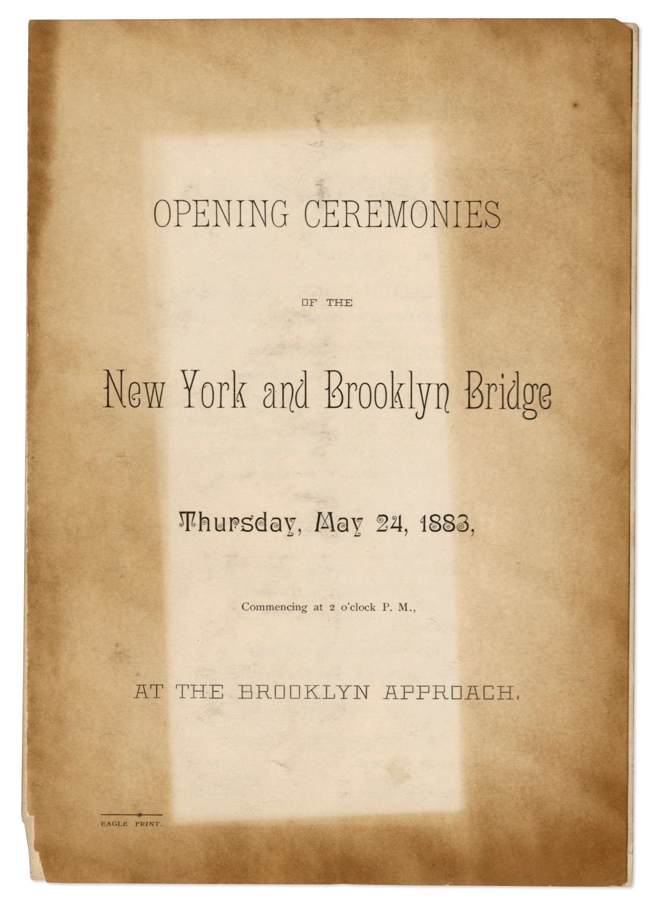 Program from the Brooklyn Bridge opening ceremonies, held 24 May 1883. Program lists the events of the ceremony, including an appearance by the President of the United States. The trustees, commissioners and engineers on the project are credited within. Runs 4pp., printed by Eagle Print. Measures 5.5'' x 8''. Block of toning to cover and separated at seam, overall very good condition.