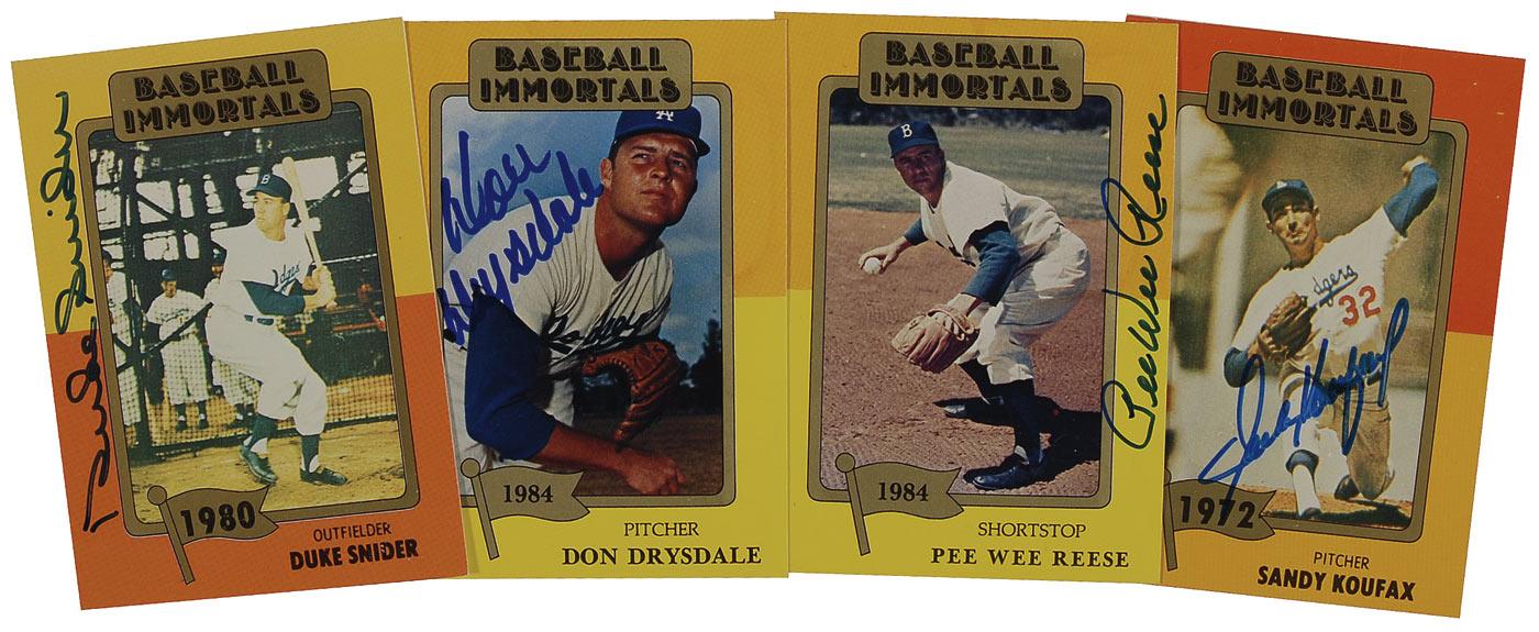 Four different Baseball Immortals trading cards, each signed on the front in blue felt tip by the respective Hall of Fame Dodger pictured: Sandy Koufax, Don Drysdale, Duke Snider, and Pee Wee Reese. In fine condition. RRAuction COA.